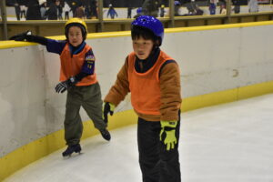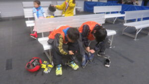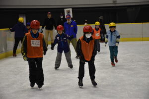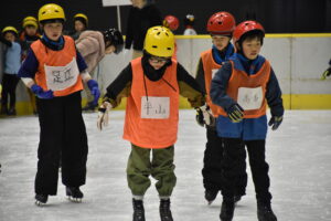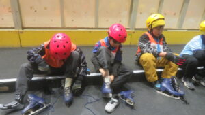 最初に、施設からの注意事項などの説明を聞いた後、スケート靴を履いてリンクへ。